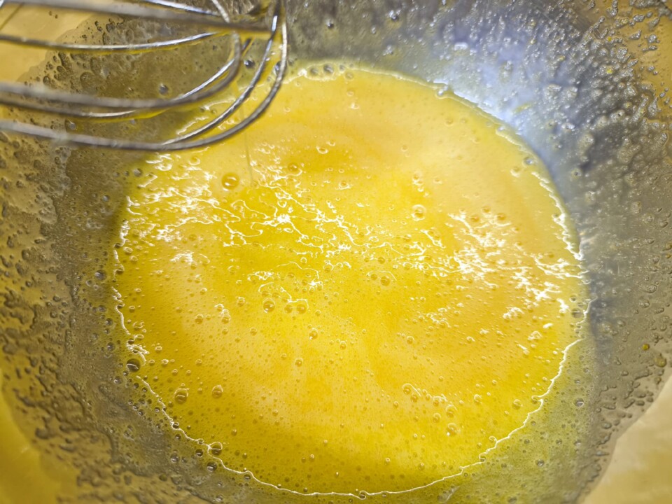 Ao mesmo tempo, numa taça grande, pesar o açúcar e adicionar os ovos partidos, batendo com umas varas durante 30 segundos, até começarem a ficar cremosos. Este passo ser feito à mão, faz toda a diferença, para aquele acabamento brilhante.