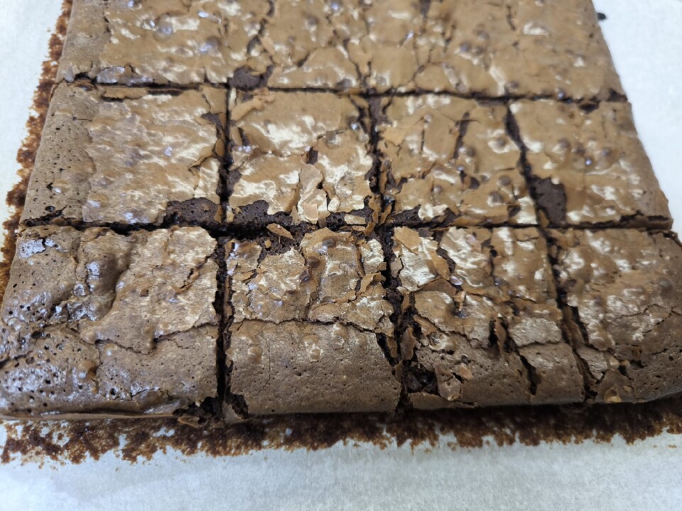 Voltando aos nossos brownies, necessitei de duas tentativas para a conseguir adaptar à Bimby, já que a maioria das pessoas que me acompanham chegaram através dela. A primeira tentativa, não ficou perfeita, o topo não ficou com estas pregas de massa brilhantes, tão características.