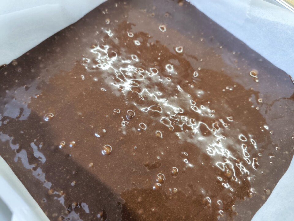 Despejar a massa na forma, espalhando-a de forma a ficar nivelada. Levar ao forno durante 30 a 35 minutos, até que o topo fique brilhante. Já deve estar firme no meio e, se espetarem um palito, deverá sair limpo mas não seco.