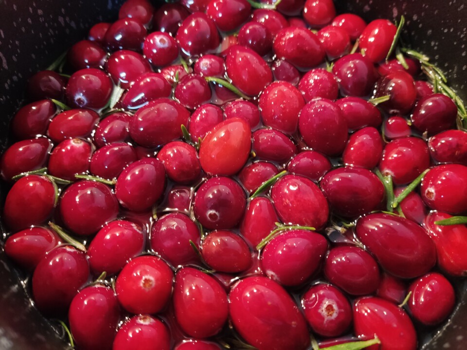 A receita original pedia muito mais alecrim, na minha opinião iria ofuscar por completo o sabor dos arandos. Passando a ser um xarope de alecrim, vermelho.